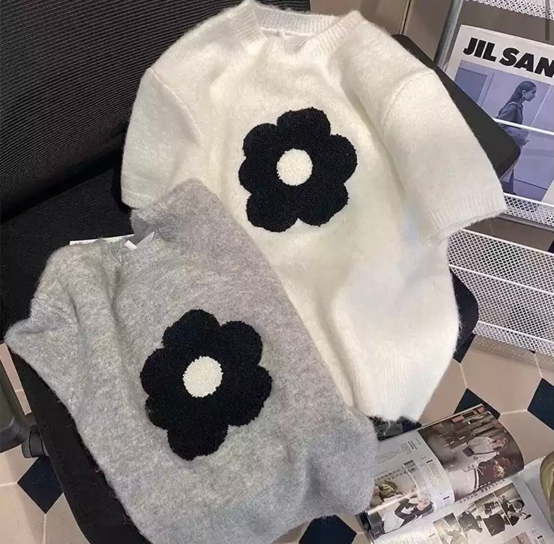 送料無料!!ショートスリーブフラワーニットトップス